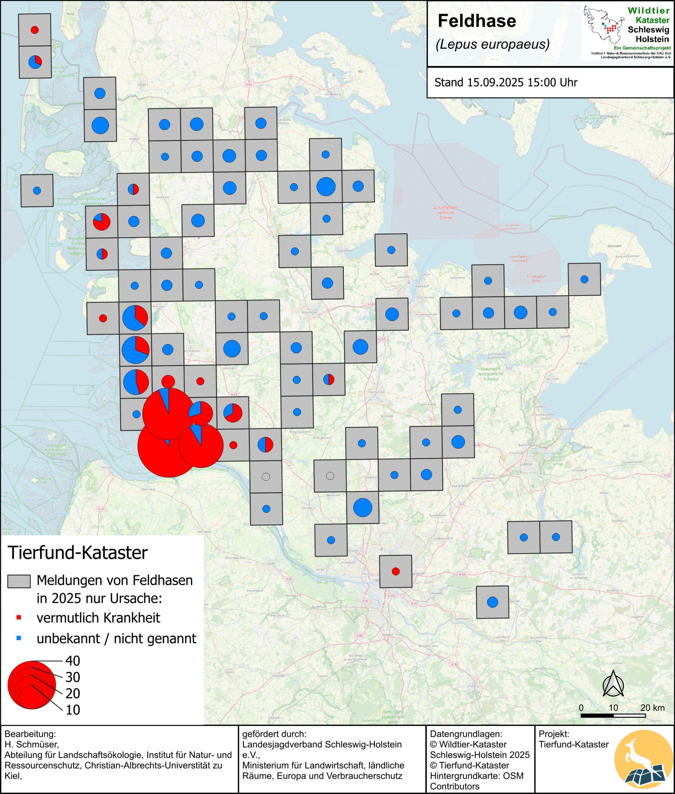 Aus gegebenem Anlass (Myxomatose: Erste Fälle bei Feldhasen in Schleswig-Holstein bestätigt) werden wir hier regelmäßig über den Stand informieren, wie er sich aus den Daten unseres Tierfund-Katasters ergibt.